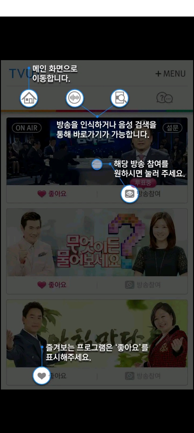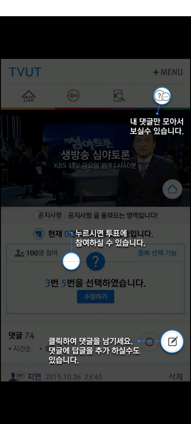 좌측 그림부터 보시면 메인화면 이동, 해당 방송 참여, 좋아요, 내 댓글만 보기, 투표참여, 댓글 남기기 등을 찾아보실 수 있습니다. 원하시는 버튼을 눌러 입장하셔서 투표 및 댓글 남기기, 좋아요 등을 하시면 됩니다.